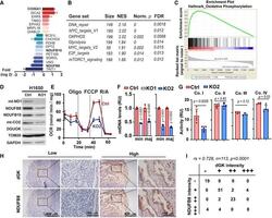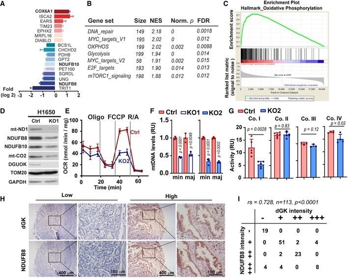 - Figure 3 DGUOK is required for mitochondrial OXPHOS in lung adenocarcinoma cells A Waterfall plot showing fold changes of 17 mitochondrial proteins differentially regulated in DGUOK KO H1650 cells. Fold changes (log 2 ) are presented as mean +- SEM of results from two independent experiments. B Top enriched pathways in DGUOK high lung adenocarcinoma ( n = 100) compared to DGUOK low lung adenocarcinoma ( n = 100) based on Gene Set Enrichment Analysis on RNA-sequencing data from the TCGA database. NES, normalized enrichment score, Norm. p , normalized P value. C Enrichment score profile of the oxidative_phosphorylation pathway in GSEA in (B). D Western blotting showing the decrease in respiration complex I subunits in DGUOK KO H1650 cells. E The effects of DGUOK depletion on mitochondrial oxygen consumption rate in H1650 cells. n = 3 independent replicates per group. F The effects of DGUOK KO on mtDNA copies in H1650 cells. Two pairs of primers recognizing minor Arc (minArc) and major Arc (majArc) region of mtDNA were used for the qPCR quantitation. G The effect of DGUOK depletion on the activities of respiratory complexes I, II, III, and IV. H Representative IHC staining showing the expression of DGUOK and NDUFB8 in lung adenocarcinoma patient specimens. I Correlation between DGUOK staining intensity and NDUFB8 staining intensity in a cohort of 113 lung adenocarcinoma patients. r s = 0.728, P < 0.0001, as determined by Spearman's correlation test. Data information: Data are sh