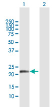 - Western Blot analysis of NDUFB10 expression in transfected 293T cell line (H00004716-T02) by NDUFB10 MaxPab polyclonal antibody.Lane 1: NDUFB10 transfected lysate(20.8 KDa).Lane 2: Non-transfected lysate.