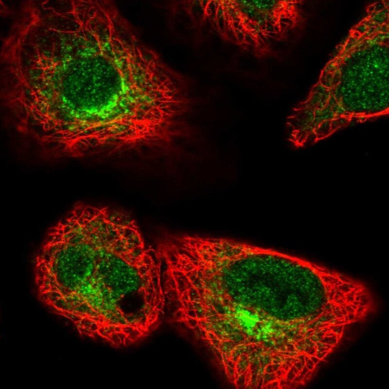 - Immunofluorescent staining of human cell line A549 shows localization to nucleoplasm & the Golgi apparatus.