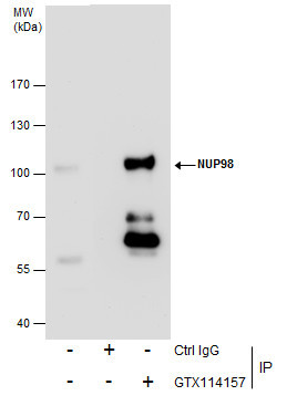 - Immunoprecipitation of NUP98 protein from HeLa whole cell extracts using 5 £gg of NUP98 antibody [N3C1], Internal (GTX114157).Western blot analysis was performed using NUP98 antibody [N3C1], Internal (GTX114157).EasyBlot anti-Rabbit IgG (GTX221666-01) was used as a secondary reagent.
