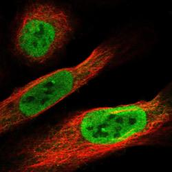 - Immunofluorescent staining of human cell line U-2 OS shows localization to nucleoplasm.
