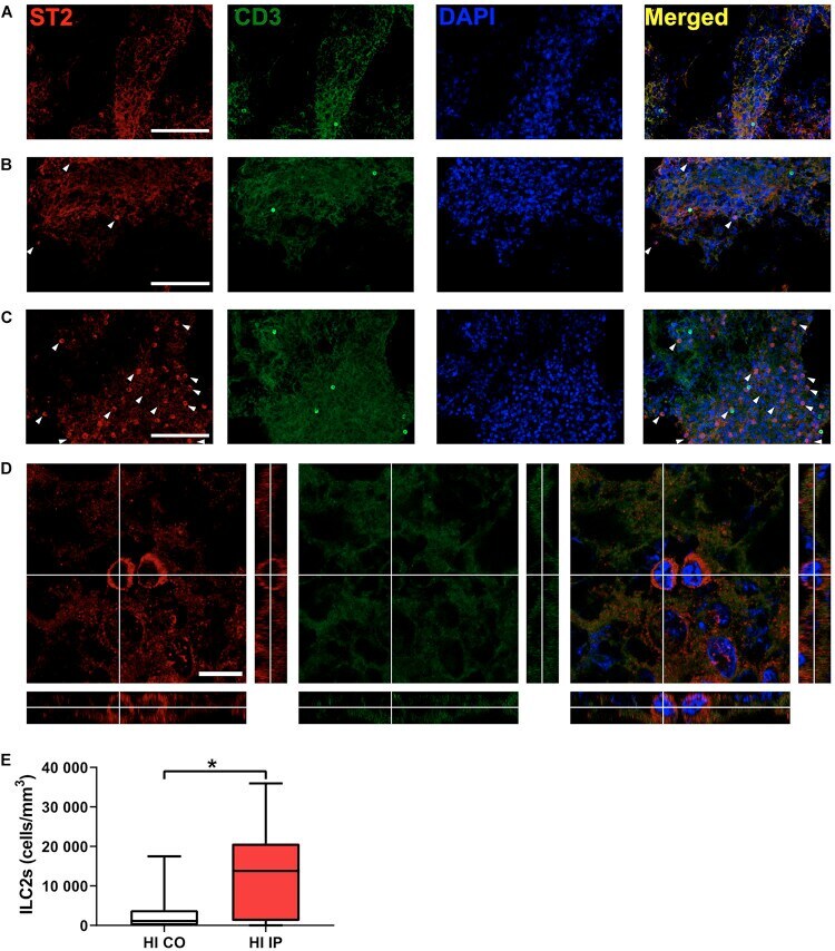 - FIGURE 3 The presence of ILC2s in the meninges in neonatal mice after HI. Representative confocal images of immunofluorescent staining showing the presence of ILC2s (CD3 - ST2 + , arrowheads) in the meninges taken from brain hemispheres in a naive mouse (A) and from the contralateral hemisphere (B) and ipsilateral hemisphere (C) in a mouse at 7 days after HI. (D) High magnification orthogonal views of cells stained with ST2. The merged picture shows cytoplasm localization of ST2 surrounding DAPI + nuclei. Scale bars: (A-C) 100 mum; (D) 10 mum. (E) The number density of ILC2-positive cells in the meninges in the ipsilateral hemisphere and contralateral hemispheres after HI. Paired t -test was used. * p < 0.05. Abbreviations: HI: hypoxia-ischemia, IP: ipsilateral hemisphere, CO: contralateral hemisphere.