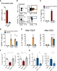 - Figure 5 EGFR Expression on Th2 Cells Is Induced by TCR Activation and Maintained by Cytokines (A-E) WT H. polygyrus -infected mice were either treated with pyrantel embonate or left untreated; mLN were collected 14 days after treatment. (A) EGFR expression on activated (CD69 + , red bars) or memory (CD25 - CD45RB low CD44 hi , blue bars) CD4 + T cells was analyzed by flow cytometry. (B) Activated CD4 + T cells were flow cytometry-sorted from infected mice into ST2 + EGFR + (red) and ST2 + EGFR - (orange) populations. Memory CD4 + T cells (CD25 - CD45RB low CD44 hi ) were flow cytometry-sorted from dewormed mice. (C) After sorting, activated EGFR + and memory cells were stimulated with rIL-33 or media only, and expression of IL-13 was determined by flow cytometry analysis. (D-E) Activated EGFR - and memory cells were cultured overnight with rTSLP or anti-CD3 antibodies, and expression of EGFR on CD4 + T cells was determined by flow cytometry analysis (D) or were re-stimulated with rIL-33 and expression of IL-13 determined by intra-cellular cytokine staining and flow cytometry analysis (E). (F-G) Egfr fl/fl xCd4-cre (EGFR DeltaCD4 ) mice were infected with H. polygyrus and received either flow cytometry-sorted activated CD4 T cells (red) (F) or flow cytometry-sorted naive or memory T cells (blue) (G) from OVA-challenged mice. Worm burden and egg counts in feces were determined 2 weeks post transfer. Data in (A)-(E) are representative of at least two independent experiments (me