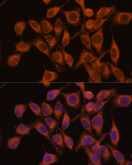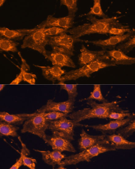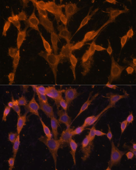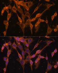- Immunofluorescence analysis of NIH/3T3 cells using UBQLNL antibody (STJ116661) at dilution of 1:100. Blue: DAPI for nuclear staining.