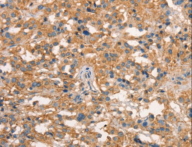 - Immunohistochemistry of paraffin-embedded Human liver cancer using ART4 Polyclonal Antibody at dilution of 1:50.