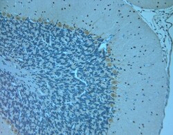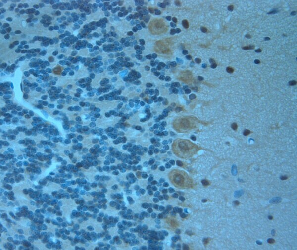 - IHC-P on paraffin sections of rat cerebellum. The animal was perfused using Autoperfuser at a pressure of 110 mmHg with 300 mL 4% FA and further post fixed overnight before being processed for paraffin embedding. HIER: Tris-EDTA, pH 9 for 20 min using Thermo PT Module. Blocking: 0.2% LFDM in TBST filtered thru 0.2 µm. Detection was done using Novolink HRP polymer from Leica following manufacturers instructions. Primary antibody: dilution 1:1000, incubated 30 min at RT (using Autostainer). Sections were counterstained with Harris Hematoxylin.