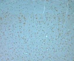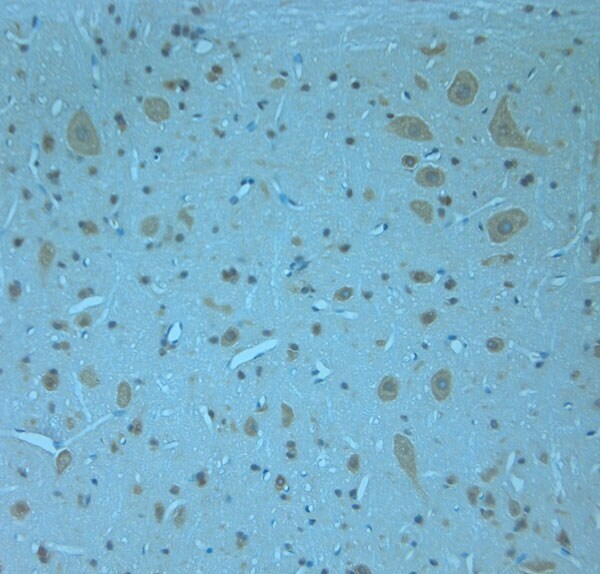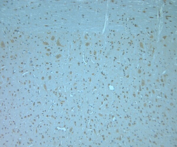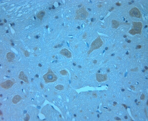 - IHC-P on paraffin sections of rat spinal cord. The animal was perfused using Autoperfuser at a pressure of 110 mmHg with 300 mL 4% FA and further post fixed overnight before being processed for paraffin embedding. HIER: Tris-EDTA, pH 9 for 20 min using Thermo PT Module. Blocking: 0.2% LFDM in TBST filtered thru 0.2 µm. Detection was done using Novolink HRP polymer from Leica following manufacturers instructions. Primary antibody: dilution 1:1000, incubated 30 min at RT (using Autostainer). Sections were counterstained with Harris Hematoxylin.