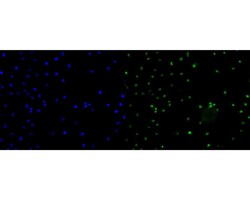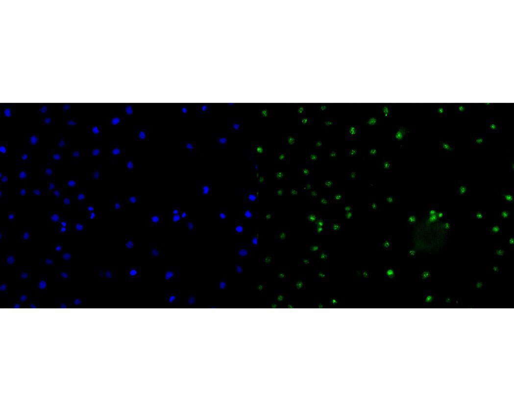 - Immunocytochemistry-Immunofluorescence analysis of of CENPB in A549 cells (green). Methanol fixed cells were blocked with 10% negative goat serum for 15 minutes at room temperature. Cells were probed with CENPB Monoclonal Antibody (Product # MA5-42558) at a dilution of 1:50 for 1 hour at room temperature, washed with PBS. Alexa Fluor 488 conjugate-Goat anti-Mouse IgG was used as the secondary antibody at 1:1,000 dilution. The nuclear counter stain is DAPI (blue).