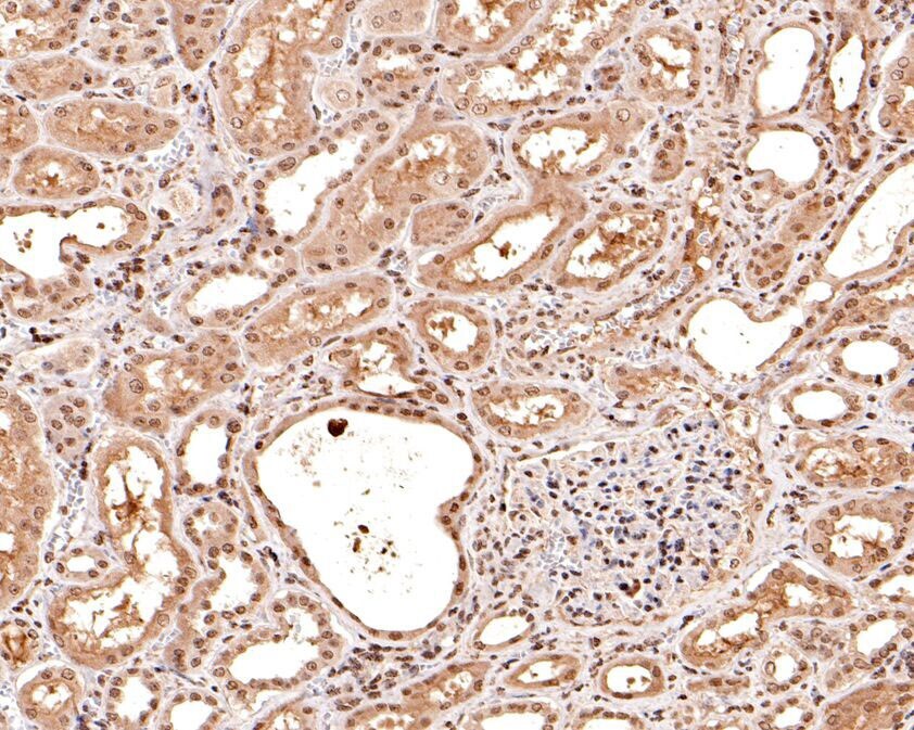 - Immunohistochemistry (Paraffin) analysis of paraffin-embedded human kidney tissue using CENPB Monoclonal Antibody (Product # MA5-42558). The section was pre-treated using heat mediated antigen retrieval with sodium citrate buffer (pH 6.0) for 20 minutes. The tissues were blocked in 1% BSA for 30 minutes at room temperature, washed with ddH2O and PBS, and then probed with the CENPB antibody at a dilution of 1:400 for 30 minutes at room temperature. The detection was performed using an HRP conjugated compact polymer system. DAB was used as the chromogen. Tissues were counterstained with hematoxylin and mounted with DPX.