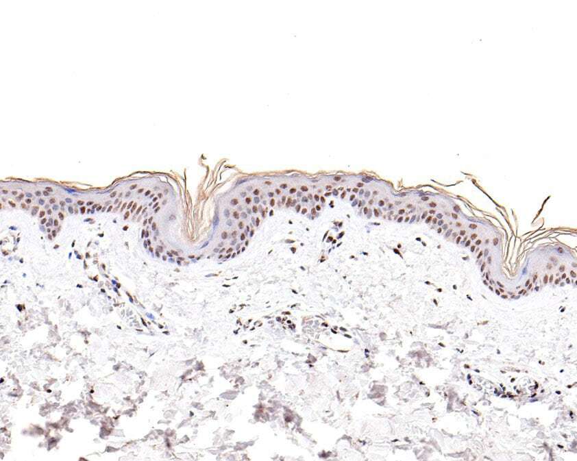 - Immunohistochemistry (Paraffin) analysis of paraffin-embedded human skin tissue using CENPB Monoclonal Antibody (Product # MA5-42558). The section was pre-treated using heat mediated antigen retrieval with sodium citrate buffer (pH 6.0) for 20 minutes. The tissues were blocked in 1% BSA for 30 minutes at room temperature, washed with ddH2O and PBS, and then probed with the CENPB antibody at a dilution of 1:100 for 30 minutes at room temperature. The detection was performed using an HRP conjugated compact polymer system. DAB was used as the chromogen. Tissues were counterstained with hematoxylin and mounted with DPX.