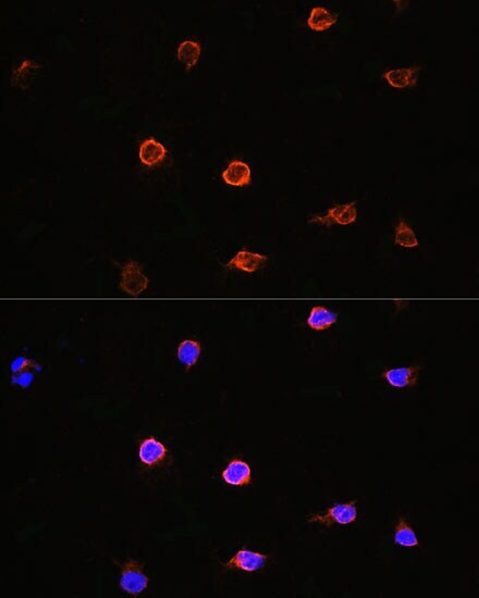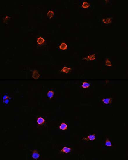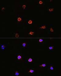- Immunocytochemistry-Immunofluorescence analysis of AIPL1 was performed in Y79 cells using AIPL1 Polyclonal Antibody (Product # PA5-89630) at a dilution of 1:100. Blue: DAPI for nuclear staining.