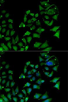 - Immunofluorescence analysis of AIPL1 in Y79 cells. Samples were incubated with AIPL1 Polyclonal antibody (Product # PA5-89630) using a dilution of 1:100. Blue: DAPI for nuclear staining.