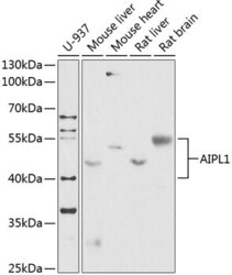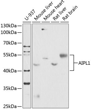 - Western blot analysis of AIPL1 in extracts of various cell lines. Samples were incubated with AIPL1 Polyclonal antibody (Product # PA5-89630) using a dilution of 1:1,000, followed by HRP Goat Anti-Rabbit IgG (H+L) at a dilution of 1:10,000. Lysates/proteins: 25 µg per lane. Blocking buffer: 3% nonfat dry milk in TBST. Detection: ECL Enhanced Kit. Exposure time: 90s.