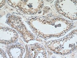 - Immunohistochemical analysis of paraffin-embedded human testis tissue slide using (Product # 14313-1-AP150UL) (DMRT1 Antibody) at dilution of 1:100 (under 40x lens).
