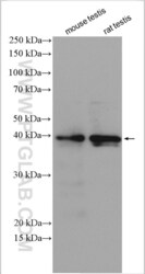 - Various lysates (mouse testis, rat testis) were subjected to SDS PAGE followed by western blot with (Product # 14313-1-AP150UL) (DMRT1 antibody) at dilution of 1:1,000 incubated at room temperature for 1.5 hours.