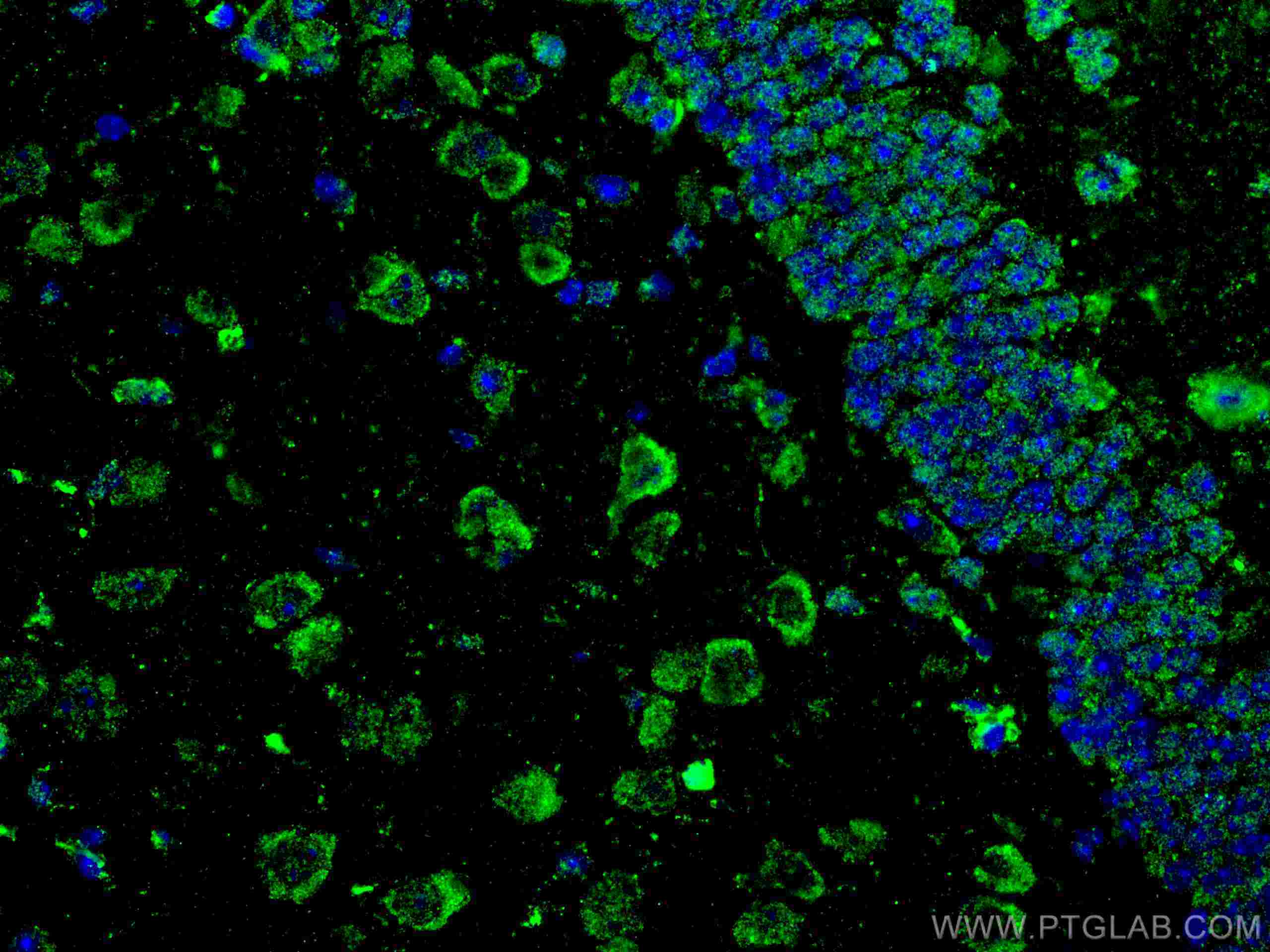 - Immunofluorescent analysis of (4% PFA) fixed mouse brain tissue using APBB1 antibody (67077-1-Ig, Clone: 1B9G10 ) at dilution of 1:400 and CoraLite®488-Conjugated AffiniPure Goat Anti-Mouse IgG(H+L).