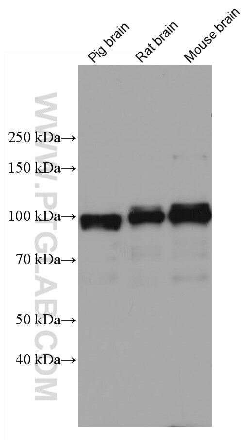- Various lysates were subjected to SDS PAGE followed by western blot with 67077-1-Ig (APBB1 antibody) at dilution of 1:1400 incubated at room temperature for 1.5 hours.