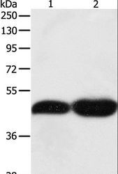 - Western blot analysis of NIH/3T3 and LNCaP cell, using TEKT1 Polyclonal Antibody at dilution of 1:500.
