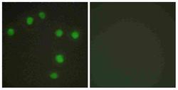- Western blot analysis of lysates from K562 and COS7 cells, using NKX6.3 Antibody. The lane on the right is blocked with the synthesized peptide.