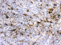 - IHC analysis of CRYAA using anti-CRYAA antibody (PB9940). CRYAA was detected in paraffin-embedded section of rat spleen tissues. Heat mediated antigen retrieval was performed in citrate buffer (pH6, epitope retrieval solution) for 20 mins. The tissue section was blocked with 10% goat serum. The tissue section was then incubated with 1μg/ml rabbit anti-CRYAA Antibody (PB9940) overnight at 4°C. Biotinylated goat anti-rabbit IgG was used as secondary antibody and incubated for 30 minutes at 37°C. The tissue section was developed using Strepavidin-Biotin-Complex (SABC)(Catalog # SA1022) with DAB as the chromogen.
