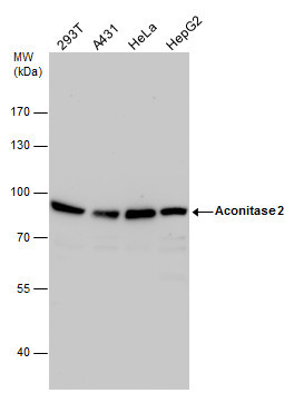 - Aconitase 2 antibody detects Aconitase 2 protein by western blot analysis. Various whole cell extracts (30 ?g) were separated by 7.5% SDS-PAGE, and the membrane was blotted with Aconitase 2 antibody (GTX114233) diluted by 1:1000. The HRP-conjugated anti-rabbit IgG antibody (GTX213110-01) was used to detect the primary antibody.