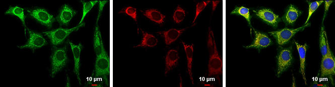 - Aconitase 2 antibody [N1N3] detects Aconitase 2 protein at mitochondria by immunofluorescent analysis.Sample: HeLa cells were fixed in 2% paraformaldehyde/culture medium at 37oC for 30 min.Green: Aconitase 2 protein stained by Aconitase 2 antibody [N1N3] (GTX114233) diluted at 1:1000.Red: MitoTrackerR Red CMXRos, a mitochondria tracker.Blue: Hoechst 33342 staining.Scale bar = 10 £gm.