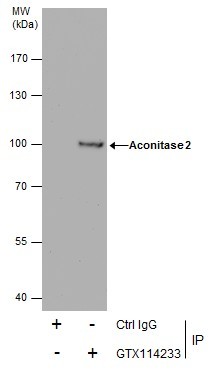- Immunoprecipitation of Aconitase 2 protein from HeLa whole cell extracts using 5 £gg of Aconitase 2 antibody [N1N3] (GTX114233).Western blot analysis was performed using Aconitase 2 antibody [N1N3] (GTX114233).EasyBlot anti-Rabbit IgG (GTX221666-01) was used as a secondary reagent.