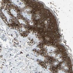 - Immunohistochemical staining of human skin shows strong cytoplasmic positivity in epidermal cells.