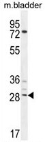 - BCA3 Antibody (N-term) western blot analysis in mouse bladder tissue lysates (35ug/lane).This demonstrates the BCA3 antibody detected the BCA3 protein (arrow).