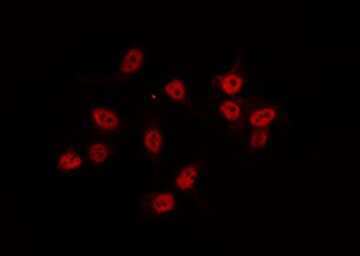 - Immunofluorescent analysis of AKIP1 in HeLa cells. Samples were fixed with paraformaldehyde, permeabilized with 0.1% Triton X-100, blocked with 10% serum (45 min at 25°C) incubated with AKIP1 polyclonal antibody (Product # PA5-106533) using a dilution of 1:200 (1 hr, 37°C), and followed by goat anti-rabbit IgG Alexa Fluor 594 at a dilution of 1:600.
