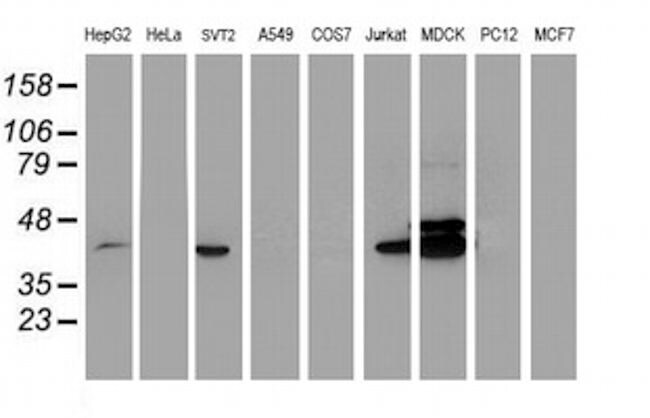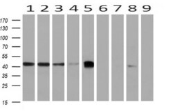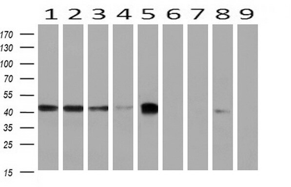 - Western blot analysis of extracts (35 µg) from 9 different cell lines by using anti-BCAT1 monoclonal antibody.