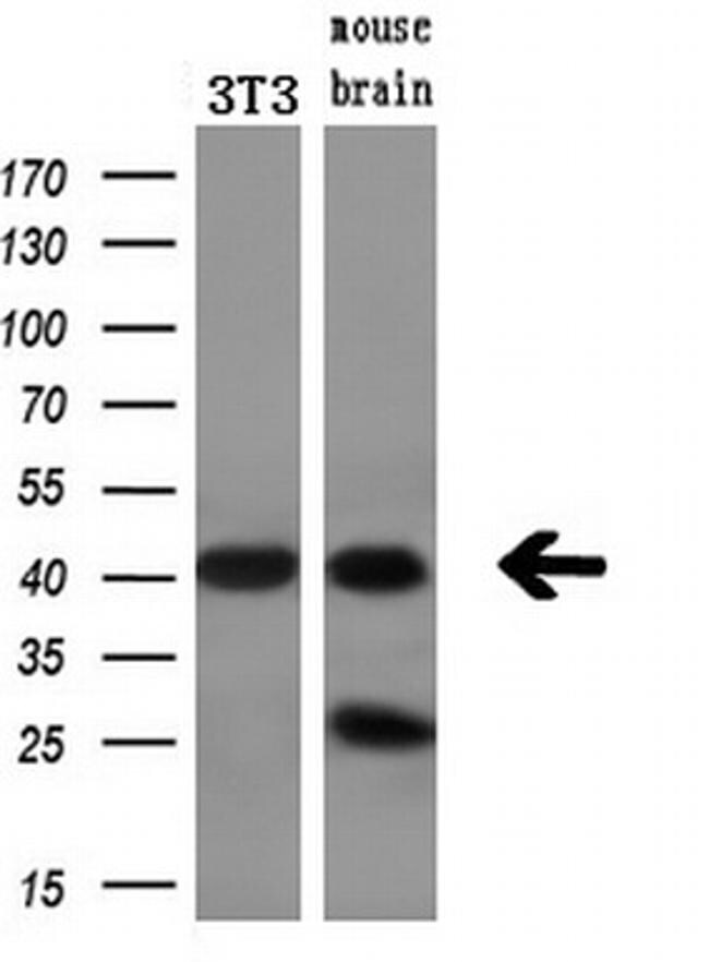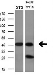 - Western blot analysis of extracts (10 µg) from a mouse cell line and a mouse tissue by using anti-BCAT1 monoclonal antibody. (1:200)