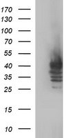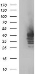 - HEK293T cells were transfected with the pCMV6-ENTRY control (Left lane) or pCMV6-ENTRY SHBG (Right lane) cDNA for 48 hrs and lysed. Equivalent amounts of cell lysates (5 ug per lane) were separated by SDS-PAGE and immunoblotted with anti-SHBG.