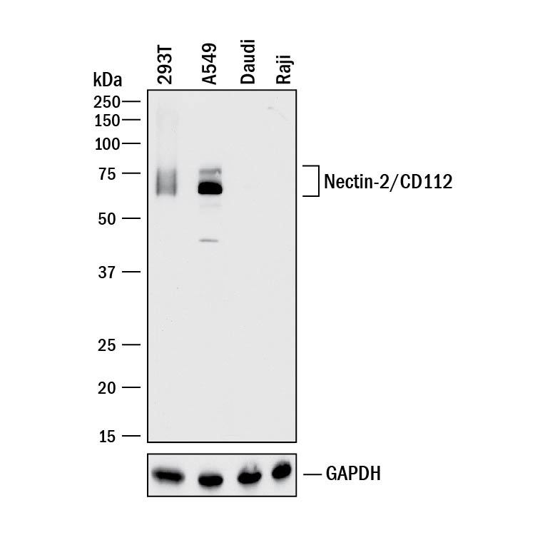 - Detection of Human Nectin-2/CD112 by Western Blot. Western blot shows lysates of 293T human embryonic kidney cell line, A549 human lung carcinoma cell line, Daudi human Burkitt's lymphoma cell line, and Raji human Burkitt's lymphoma cell line. PVDF membrane was probed with 0.1 µg/mL of Goat Anti-Human Nectin-2/CD112 Antigen Affinity-purified Polyclonal Antibody (Catalog # AF2229) followed by HRP-conjugated Anti-Goat IgG Secondary Antibody (Catalog # HAF017). A specific band was detected for Nectin-2/CD112 at approximately 60-75 kDa (as indicated). Daudi human Burkitt's lymphoma cell line and Raji human Burkitt's lymphoma cell line are shown as negative controls. GAPDH (Catalog # AF5718) is shown as a loading control.This experiment was conducted under reducing conditions and using Immunoblot Buffer Group 1.