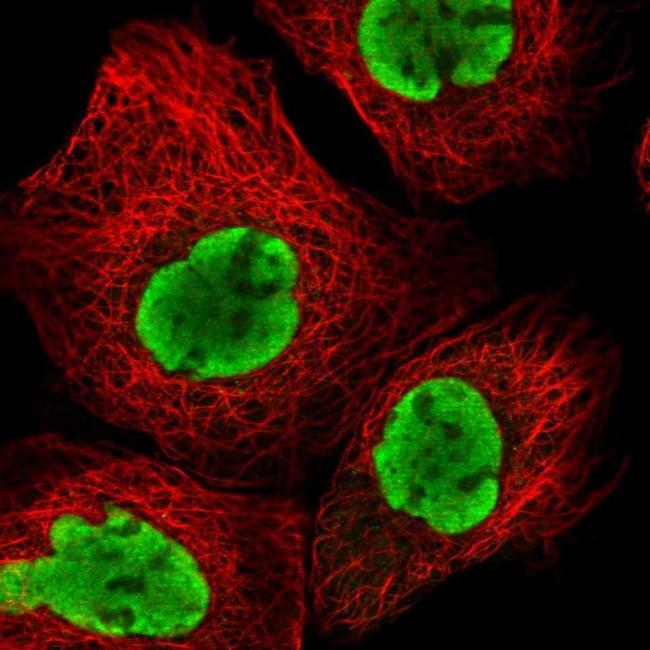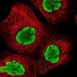 - Immunofluorescent staining of ESF1 in human cell line A-431 shows positivity in nucleus but excluded from the nucleoli. Samples were probed using an ESF1 Polyclonal Antibody (Product # PA5-61419).