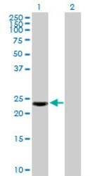 - Western Blot analysis of KRTAP10-2 expression in transfected 293T cell line (H00386679-T02) by KRTAP10-2 MaxPab polyclonal antibody.Lane 1: KRTAP10-2 transfected lysate(28.05 KDa).Lane 2: Non-transfected lysate.