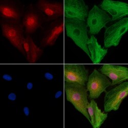 - Immunocytochemistry analysis of TROY in A549 cells. Samples were treated with PFA, permeabilized in 0.1% Triton X-100, blocked in 10% serum (45 min at 25°C), and incubated with polyclonal antibody (Product # PA5-116076). Secondary staining was applied with mouse anti-beta tubulin (1 hr at 37°, AlexaFluor 594 conjugated goat anti-rabbit IgG (Red), AlexaFluor 488 conjugated goat anti-mouse IgG (Green) and DAPI.