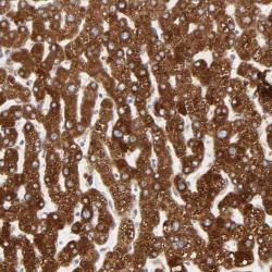 - Immunohistochemical staining of human liver shows strong cytoplasmic positivity in hepatocytes.