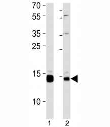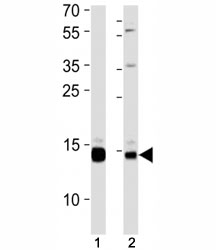 - SUMO2/3 antibody western blot analysis in (1) 293 cell line and (2) rat liver tissue lysate. Observed molecular weight: 12-15 kDa.