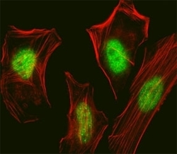 - Fluorescent confocal image of HeLa cell stained with SUMO2/3 antibody. HeLa cells were fixed with 4% PFA (20 min), permeabilized with Triton X-100 (0.1%, 10 min), then incubated with primary Ab (1:25, 1 h at 37oC). For secondary Ab, Alexa Fluor 488 conjugated donkey anti-rabbit Ab (green) was used (1:400, 50 min at 37oC). Cytoplasmic actin was counterstained with Alexa Fluor 555 (red) conjugated Phalloidin (7units/ml, 1 h at 37oC). Nuclei were counterstained with DAPI (blue) (10 ug/ml, 10 min). immunoreactivity is localized to the nucleus.
