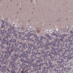 - Immunohistochemical analysis of DIS3 in human cerebellum using DIS3 Polyclonal Antibody (Product # PA5-58723) shows moderate nuclear positivity in Purkinje cells.