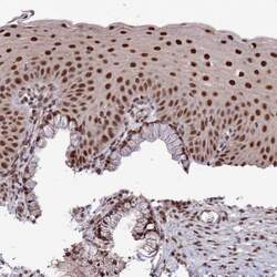 - Immunohistochemical analysis of DIS3 in human cervix using DIS3 Polyclonal Antibody (Product # PA5-58723) shows strong nuclear positivity in squamous epithelial cells.