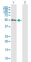 - Western Blot analysis of CHIT1 expression in transfected 293T cell line (H00001118-T01) by CHIT1 MaxPab polyclonal antibody.Lane 1: CHIT1 transfected lysate(51.26 KDa).Lane 2: Non-transfected lysate.