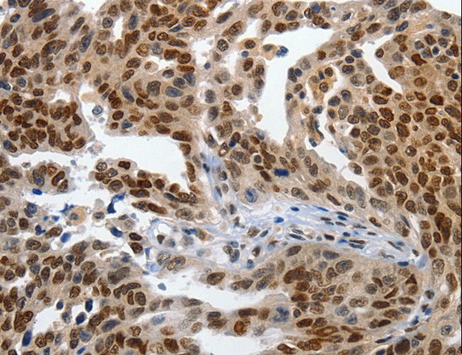 - Immunohistochemistry of paraffin-embedded Human ovarian cancer using KLF5 Polyclonal Antibody at dilution of 1:120.