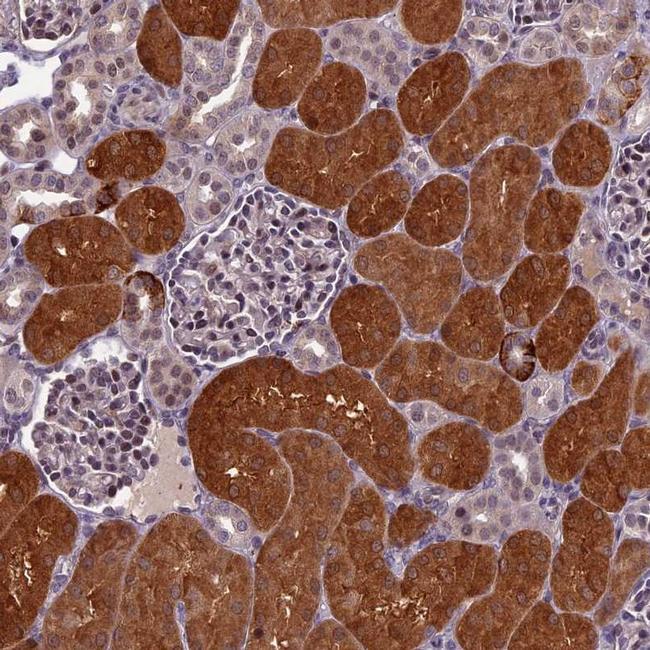 - Immunohistochemical staining of SV2C in human kidney tissue shows strong cytoplasmic positivity in cells in tubules. Samples were probed using a SV2C Polyclonal Antibody (Product # PA5-59267).