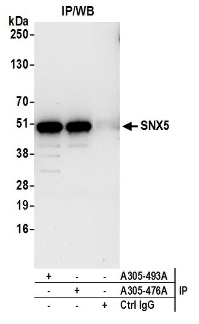 - Detection of human SNX5 by western blot of immunoprecipitates. Samples: Whole cell lysate (0.5 or 1.0 mg per IP reaction; 20% of IP loaded) from 293T cells prepared using NETN lysis buffer. Antibodies: Affinity purified rabbit anti-SNX5 antibody A305-493A (lot A305-493A-1) used for IP at 6 µg per reaction. SNX5 was also immunoprecipitated by rabbit anti-SNX5 antibody A305-476A. For blotting immunoprecipitated SNX5, A305-493A was used at 1 µg/ml. Detection: Chemiluminescence with an exposure time of 10 seconds.