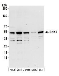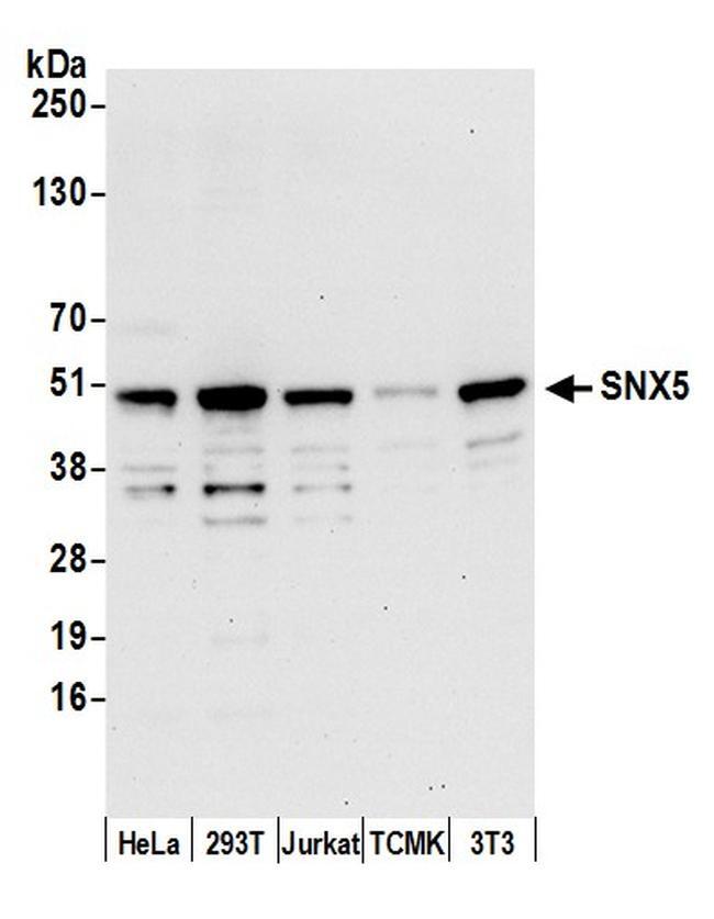 - Detection of human and mouse SNX5 by western blot. Samples: Whole cell lysate (15 µg) from HeLa, 293T, Jurkat, mouse TCMK-1, and mouse NIH3T3 cells prepared using NETN lysis buffer. Antibody: Affinity purified rabbit anti-SNX5 antibody A305-493A (lot A305-493A-1) used for WB at 0.1 µg/ml. Detection: Chemiluminescence with an exposure time of 30 seconds.