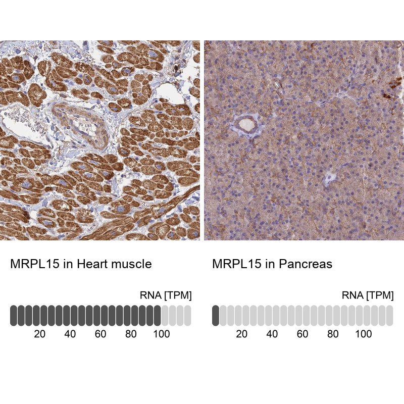 - Immunohistochemistry analysis in human heart muscle and pancreas tissues using Anti-MRPL15 antibody. Corresponding MRPL15 RNA-seq data are presented for the same tissues.