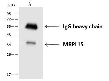 - MRPL15 Immunoprecipitation using: Lane A: 0.5 mg HeLa Whole Cell Lysate 4 µL with MRPL15 Polyclonal Antibody (Product # PA5-118072) and 60 μg of Immunomagnetic beads Protein A/G. Primary antibody: MRPL15 Polyclonal Antibody, at 1:100 dilution. Secondary antibody: Goat Anti-Rabbit IgG (H+L) /HRP at 1:10,000 dilution. Developed using the ECL technique. Performed under reducing conditions. Predicted band size: 33 kDa. Observed band size: 34 kDa.