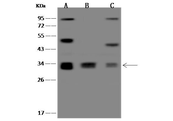 - Western Blot using MRPL15 Polyclonal Antibody (Product # PA5-118072) at 1:500 dilution. Lane A: HeLa Whole Cell Lysate, Lane B: 293T Whole Cell Lysate, Lane C: MCF7 Whole Cell Lysate. Lysates/proteins at 30 μg per lane. Secondary antibody: Goat Anti-Rabbit IgG (H+L)/HRP at 1:10,000 dilution. Developed using the ECL technique. Performed under reducing conditions. Predicted band size: 33 kDa. Observed band size: 33 kDa. (We are unsure of the identity of these extra bands).